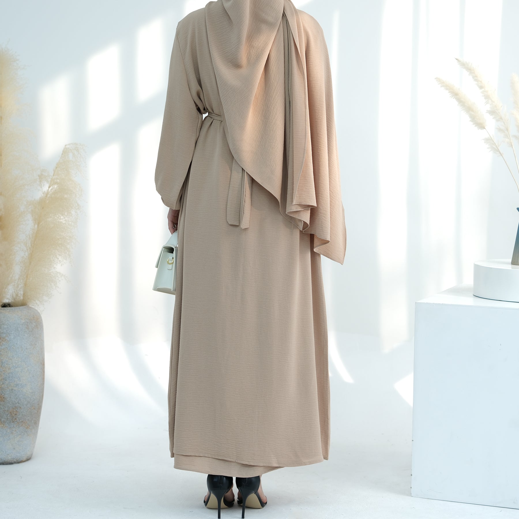 The Amal 2 piece Abaya features a sleeveless underslip dress designed for comfort and ease of movement. Constructed from breathable materials, it facilitates airflow, making it suitable for warm climates. The included belt allows for adjustable styling, enhancing the overall silhouette and fit.