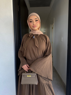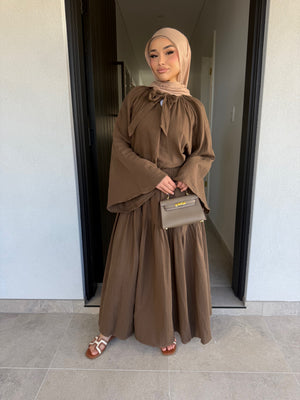 The Aura set is the perfect addition to your summer wardrobe. Featuring a linen skirt set, this outfit is both breezy and modest, making it suitable for any occasion. Stay cool and stylish with this must-have ensemble.