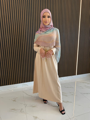 The Luna dress is a cotton slip on dress features a beautiful gold tie, adding a touch of elegance to any outfit. Made with high-quality cotton, this dress is comfortable and stylish, perfect for any occasion. Can be worn under abaya as a cotton slip dress or worn on its own with the gold belt