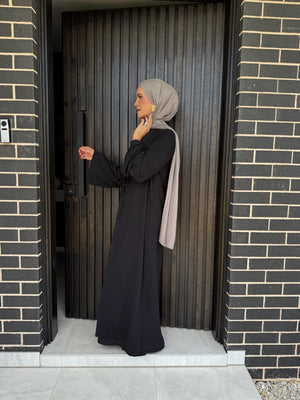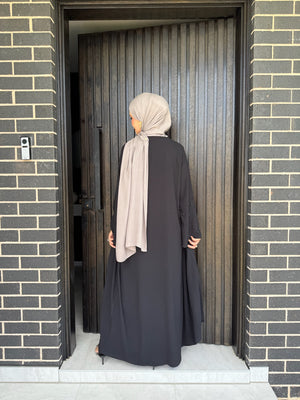 This Imaan Abaya features a unique tie detail and elegant pearl sleeves that add a touch of sophistication to its classic design. Made from high-quality material, it offers both comfort and style, making it a must-have for any modest wardrobe. Elevate your look with this modern yet modest abaya.